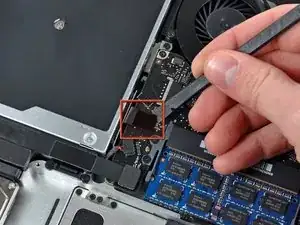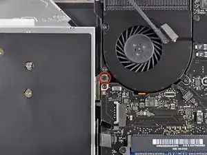 Снимите один винт Phillips, 3.5 мм, фиксирующий внутреннюю сторону оптического привода к верхней части корпуса.