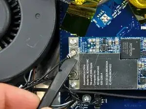 Используйте плоский конец лопатки, чтобы приподнять оба разъема антенных кабелей с карты AirPort.