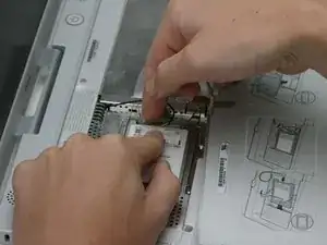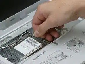 Толкните проволочную скобу к карте AirPort и поднимите ее, чтобы освободить от щита ОЗУ.