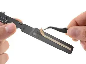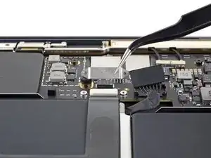 Используйте Torx T3, чтобы выкрутить два винта 1,4 мм, фиксирующие крышку кабеля трекпада.