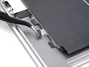Слева на MacBook используйте пинцет, чтобы отогнуть три чёрных вытяжных язычка на клейких полосах батареи, пока вы не сможете захватить их пальцами.