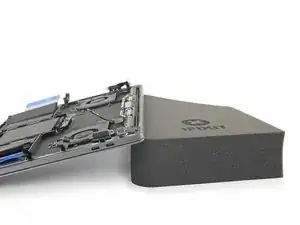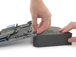 Чтобы контролировать поток растворителя и отводить его от динамика, приподнимите правый край MacBook Pro на несколько сантиметров, положив под него книгу или кусок пены.