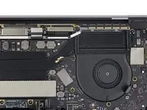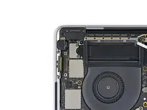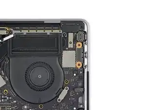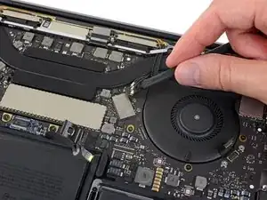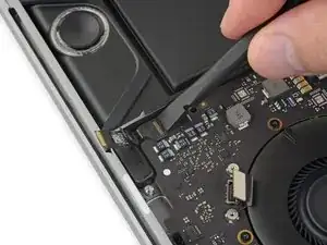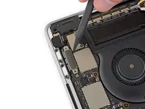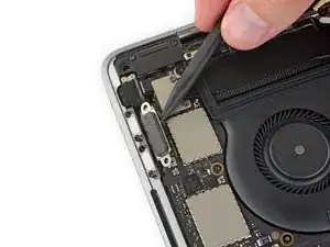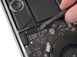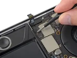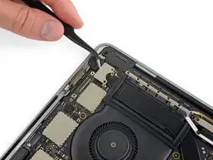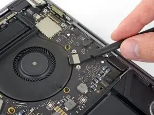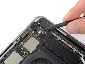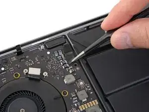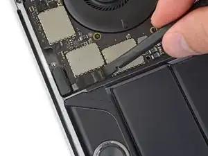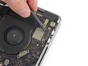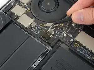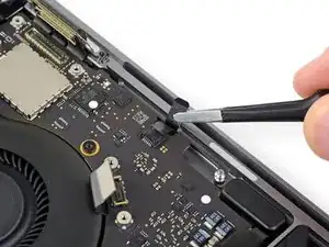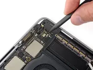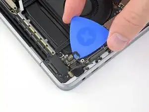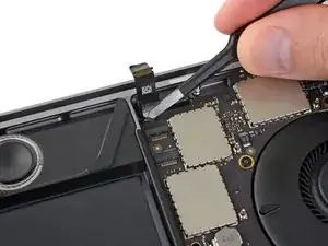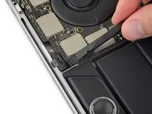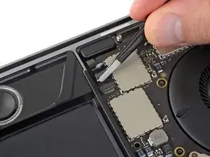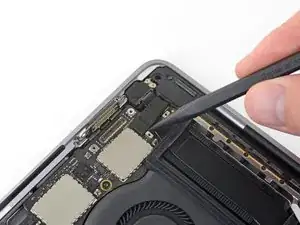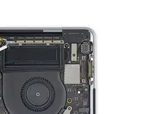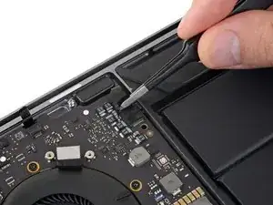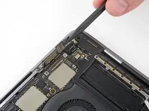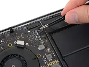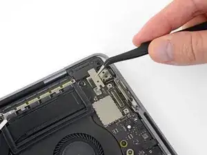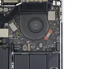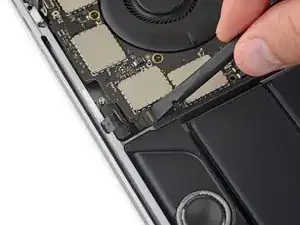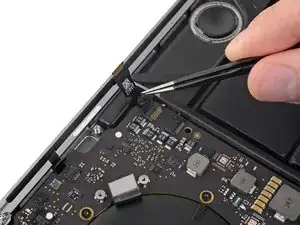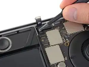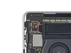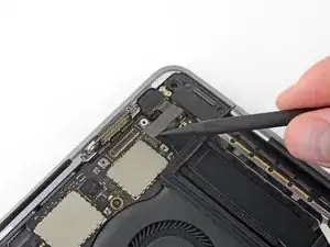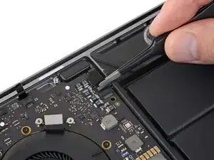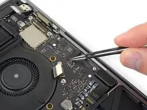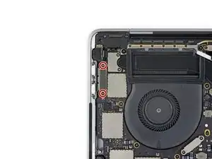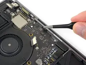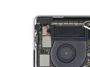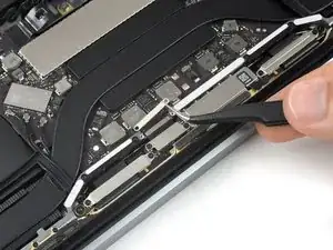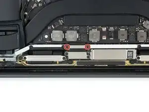Снимите два винта T3 Torx длиной 1,7 мм, фиксирующие алюминиевую крышку над гибким разъёмом кабеля дисплея.