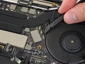 Используйте кончик лопатки, чтобы поддеть и поднять небольшой чёрный фиксатор, удерживающий кабель в его разъёме.