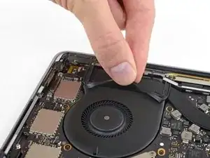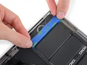 Приложите лопаткой по всей кромке ленты, чтобы плотно приклеить её к алюминиевому корпусу MacBook Pro и изолировать динамик от батареи.