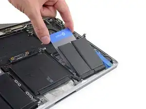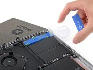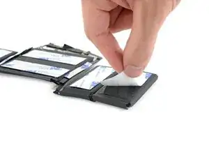 Временно оставьте пластиковую карту на месте, чтобы предотвратить повторное приклеивание левых аккумуляторных ячеек.