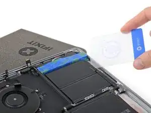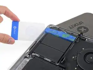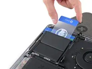 Просуньте пластиковую карту полностью под левую крайнюю ячейку — ту, которую вы уже отделили на предыдущих шагах — а затем аккуратно вставьте её между оставшейся левой ячейкой и алюминиевым корпусом MacBook Pro.