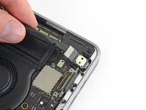 Поднимите разъём достаточно высоко, чтобы он оставался в отрыве от гнезда. Если он случайно соединится во время ремонта, это может повредить ваш MacBook Pro.