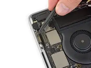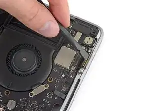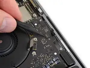С помощью лопатки отсоедините гибкий кабель трекпада, аккуратно поднимая его разъём прямо вверх от платы.