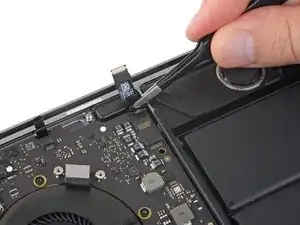 Снимите скобу разъёма кабеля трекпада пинцетом.
