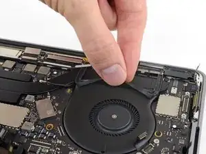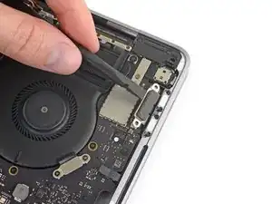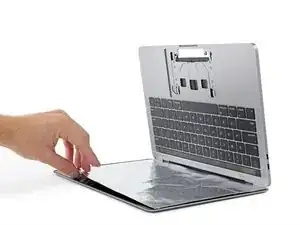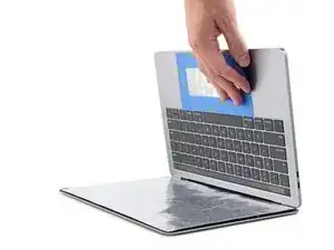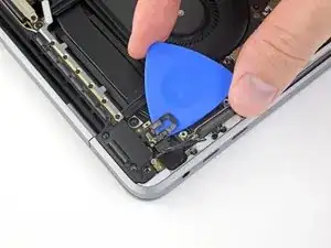 Начните с поднятия левой стороны MacBook Pro, чтобы направить сток средства для удаления клея в сторону от динамика.