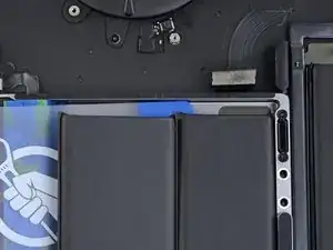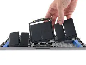 Оставшиеся две меньшие аккумуляторные ячейки размещены на слегка приподнятой части алюминиевой рамки MacBook.