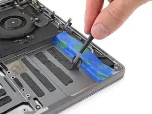 Используйте отвертку Torx T3, чтобы снять два винта 1,9 мм со скобы разъёма клавиатуры.