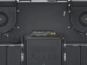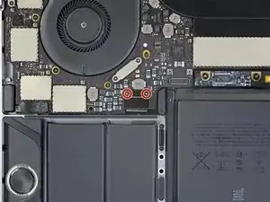 Используйте отвёртку T5 Torx, чтобы отвинтить два винта 3,2 мм, крепящих плату батареи.