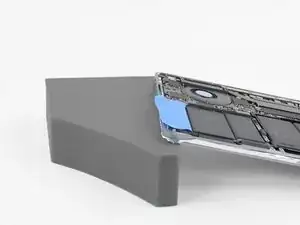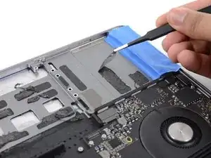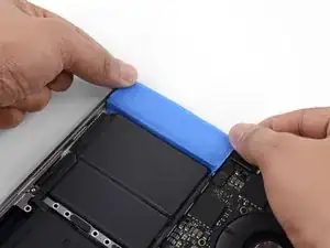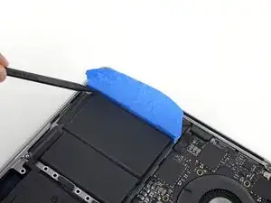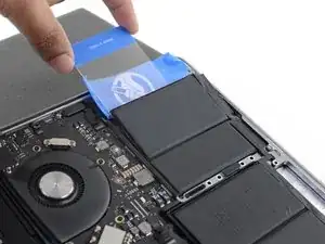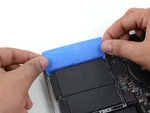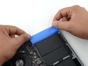 Прижмите ленту по всей её кромке лопаткой, чтобы надёжно приклеить её к алюминиевому корпусу MacBook Pro, изолировав динамик от батареи.