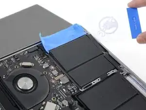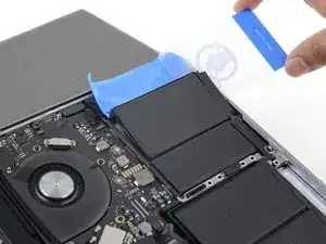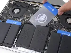 Просуньте пластиковую карту полностью под крайнюю левую батарею — которую вы уже отделили на предыдущих шагах — затем аккуратно вставьте её между оставшейся левой ячейкой и алюминиевым корпусом MacBook Pro.