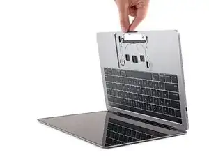 Установите её на место и совместите направляющие защёлки возле шарнира дисплея. Нажмите вниз и сдвиньте крышку в сторону шарнира. Крышка должна перестать скользить, когда защёлки зацепятся.