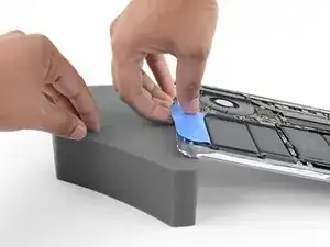 Приготовьте iOpener и положите его на ленточный кабель трекпада примерно на одну минуту, чтобы смягчить клей, фиксирующий кабель трекпада к верхней части батареи.
