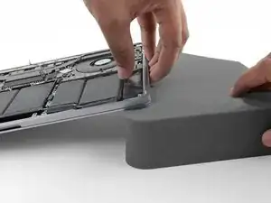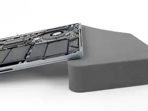 Чтобы контролировать поток средства для удаления клея и направить его от динамика, приподнимите правый край MacBook Pro на несколько сантиметров, положив под него книгу или поролоновый брусок.
