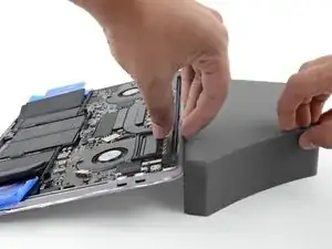 Начните с приподнимания левой стороны MacBook Pro, чтобы направить стекание растворителя клея в сторону от динамика.