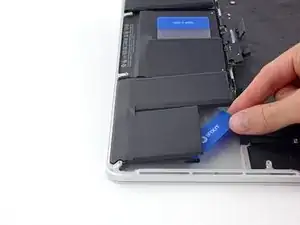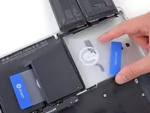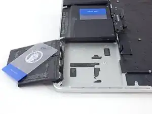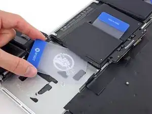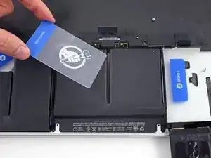 Оставьте пластиковую карточку под ячейкой аккумулятора, чтобы она не приклеилась обратно, пока вы переходите к следующему шагу.