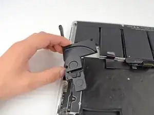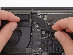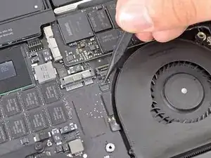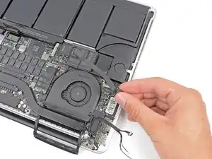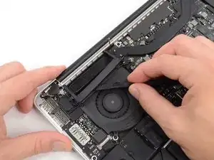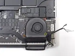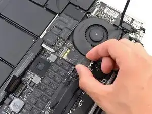 Поднимите и выньте правый вентилятор из корпуса MacBook Pro.