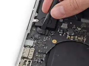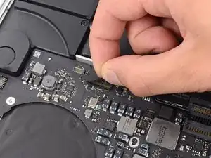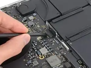 Используйте плоский конец пластиковой лопатки, чтобы поддеть разъём лентового кабеля трекпада и вынуть его из гнезда.