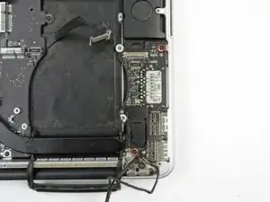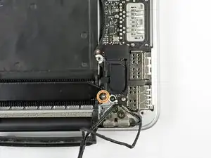 Удалите один 2,9 мм винт T5 Torx, фиксирующий карту AirPort к плате логики.