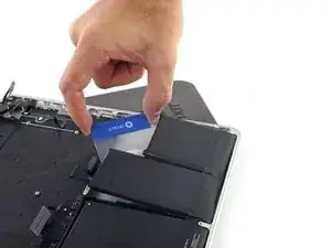 Может помочь аккуратно провернуть карточку, чтобы слегка приподнять зазор между ячейкой аккумулятора и корпусом MacBook Pro.