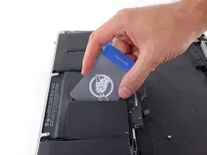 Продвигайте карточку дальше под ячейку аккумулятора, чтобы отделить её от клеевого слоя, фиксирующего её к верхней крышке MacBook Pro.
