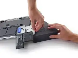 В следующих шагах вы нанесёте растворитель для клея на правый (внешний) край аккумулятора. Поднятая сторона MacBook Pro поможет растворителю стекать под аккумулятор.