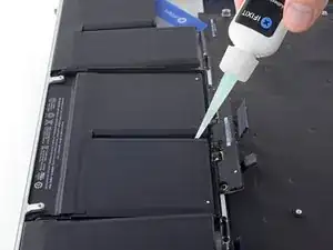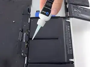 Приподняв левый край MacBook Pro, нанесите несколько капель средства для растворения клея по центральной линии между двумя средними ячейками аккумулятора.