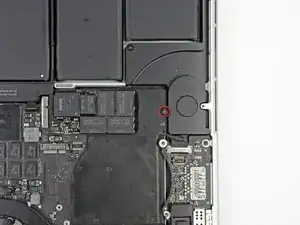 Удалите один винт T5 Torx 3,1 мм, фиксирующий SSD на плате.