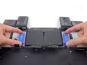 С одной пластиковой картой под каждой из двух центральных ячеек аккумулятора, поверните и поднимите обе карты, чтобы полностью оторвать ячейки аккумулятора вместе с пластиковой рамкой и платой аккумулятора от MacBook Pro.