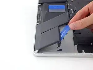 Удалите первую пластиковую карту, которую вы вставили под право-центральную ячейку аккумулятора.