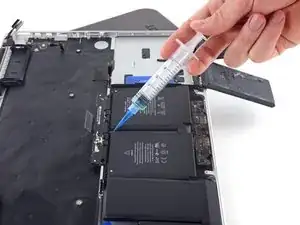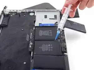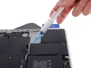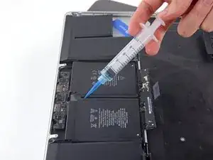 Приподняв левый край MacBook Pro, нанесите небольшое количество (≈1 мл) средства для удаления клея по центральной линии между двумя средними батарейными ячейками.