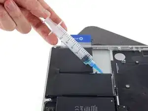 Подождите 2–3 минуты, чтобы жидкость пропитала клеевую поверхность под батарейной ячейкой, прежде чем переходить к следующему шагу.
