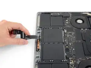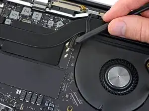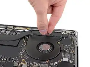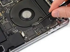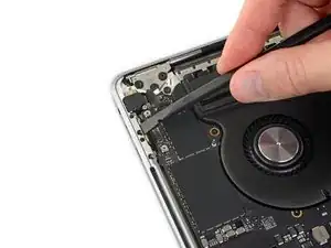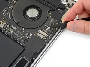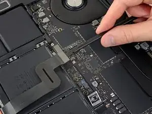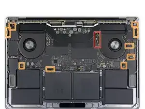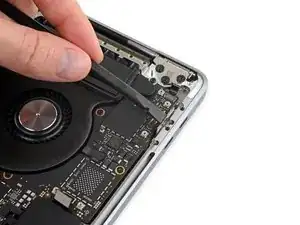 Перейдите на левую сторону MacBook Pro и повторите предыдущий шаг, чтобы отделить ещё два элемента батареи.