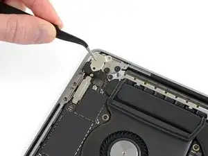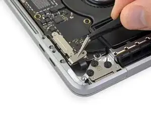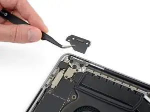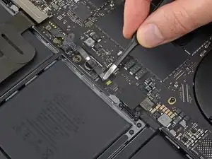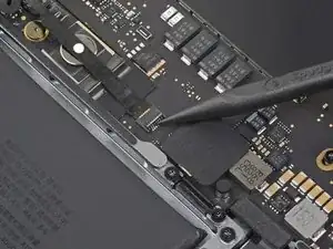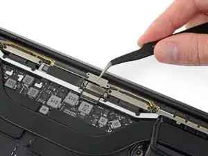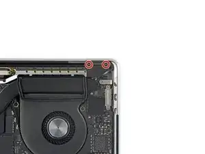 Используйте отвертку T3 Torx, чтобы вывернуть два винта 1.9 мм, фиксирующие монтажную планку крышки для разъёмов шлейфа клавиатуры и тачпада.