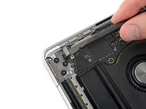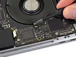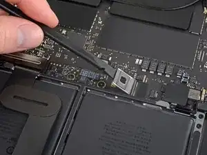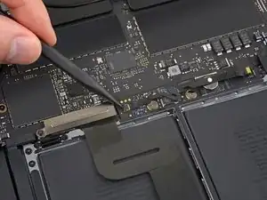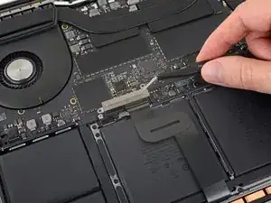 Отделите и снимите изоляционную наклейку, закрывающую плату аккумулятора, на краю логической платы, ближайшем к аккумулятору.