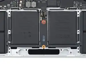 В MacBook Pro используются растягивающиеся клейкие ленты для крепления аккумулятора. Некоторые полосы скрыты под трекпадом, поэтому сначала нужно снять трекпад, чтобы получить доступ к лентам.