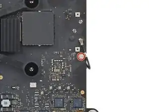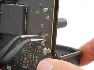 Свободной рукой используйте отвертку Torx T5, чтобы удалить винт длиной 2,9 мм (с шайбой), крепящий кабель антенны 1 к плате логики.