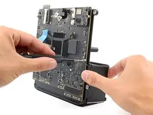 Свободной рукой аккуратно приподнимите край узла логической платы с модулями SSD, пока не сможете ухватиться за вентиляторы. При необходимости сдвиньте узел в сторону выреза для сетевого кабеля, чтобы помочь при подъёме.