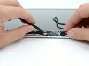 Перед отключением кабеля камеры сначала необходимо отодвинуть небольшой пластиковый фиксатор, приклеенный к плате логики. В моделях конца 2011 года этот шаг можно пропустить, так как на разъёме кабеля камеры нет пластикового фиксатора.