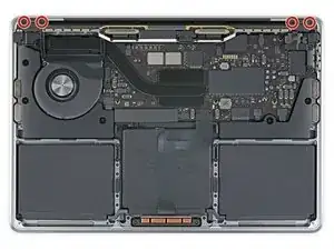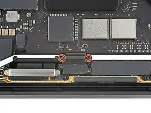 Снимите четыре винта T3 Torx 1,5 мм, фиксирующие две алюминиевые крышки сверху двух разъёмов кабелей дисплея.