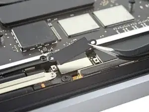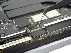 Снимите два винта T3 Torx 1,7 мм, фиксирующие алюминиевую крышку сверху гибкого разъёма кабеля дисплея.