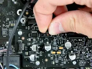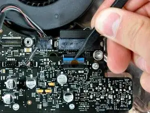 С помощью конца лопатки поднимите фиксатор кабеля аудио к плате логики (в сторону нижнего края вашего iMac).
