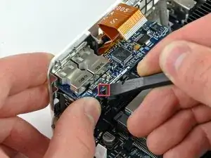 Воспользуйтесь пинцетом, чтобы отсоединить разъём кабеля датчика тепла жёсткого диска от разъёма на логической плате.