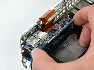 Воспользуйтесь кончиком лопатки, чтобы слегка приподнять левую сторону фиксатора кабеля ZIF из его разъёма.