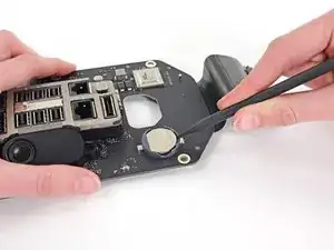 Используйте наконечник лопатки, чтобы поддеть и вынуть батарейку CMOS из её гнезда.